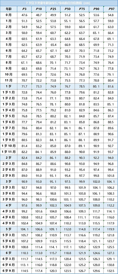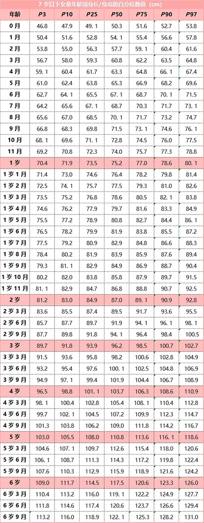 家長(zhǎng)可以對(duì)照下面由衛(wèi)健委發(fā)布的《7 歲以下兒童生長(zhǎng)標(biāo)準(zhǔn)》,根據(jù)孩子的性別、年齡,找到孩子身高所處的區(qū)間,了解寶寶身高是否達(dá)標(biāo)。