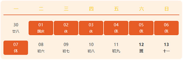 放假時(shí)間:10月1號至10月7號,共計(jì)7天,9月29號(星期天),10月12號(星期六)正常上班。